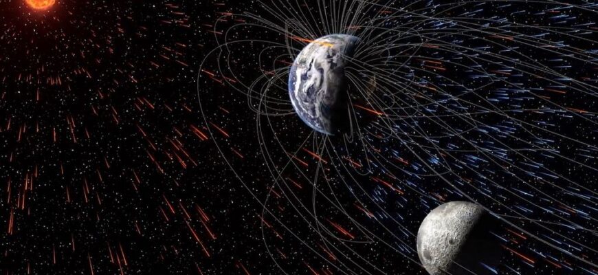 Місяць не має власної атмосфери, проте протягом мільярдів років він міг отримувати її частинки безпосередньо від Землі. Художнє зображення сонячного вітру