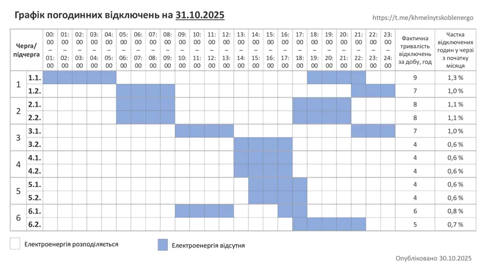 За розпорядженням НЕК «Укренерго» у п’ятницю, 31 жовтня 2025 року на Хмельниччині діятиме графік погодинних відключень.
