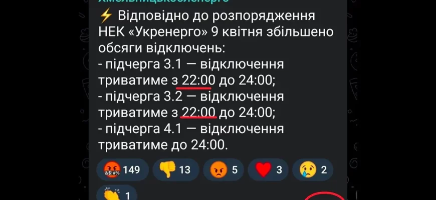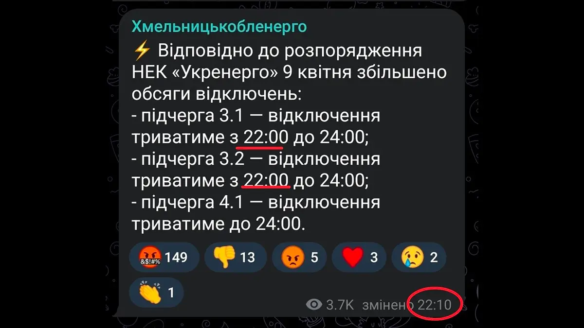 Спочатку вимкнули світло – потім повідомили про збільшення обсягів відключень. В такому режимі відбулося чергове, восьме, коригування графіка погодинних відключень від обленерго сьогодні, 9 квітня на Хмельниччині.