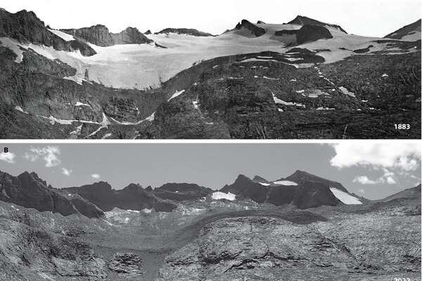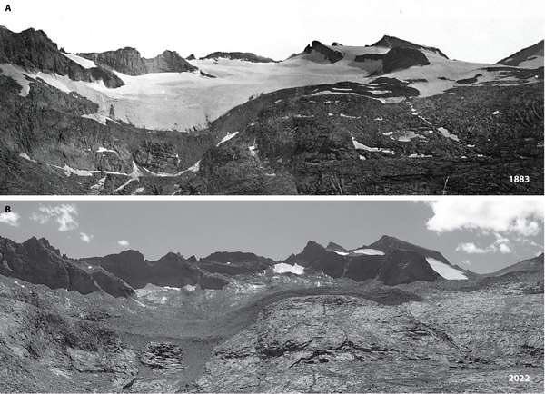 Повторна фотографія льодовика Східний Лайєлл у Національному парку Йосеміті. Вересень 1883 року проти вересня 2022 року. Авторство: Ізраель Рассел (Геологічна служба США) та Грег Сток (Служба національних парків).