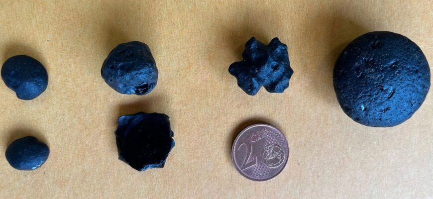 - Тектити (tektites): Природне скло, утворене від розплавлення порід під час удару астероїда чи комети; вони вилітають на великі відстані від кратера і не містять кристалічних включень.
