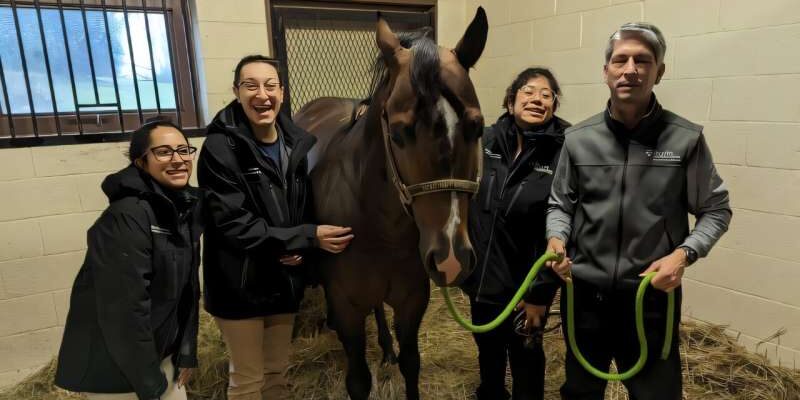 Наггет, один із жеребців Центру Нью-Болтон, сфотографований разом зі своєю командою догляду (зліва направо): резидентка Ліззі Суарес, ветеринарний технік Ешлі Спевак, резидентка Лілі Сандовал та кінолог Бен Гессфорд. Фото: Пенсильванський університет
