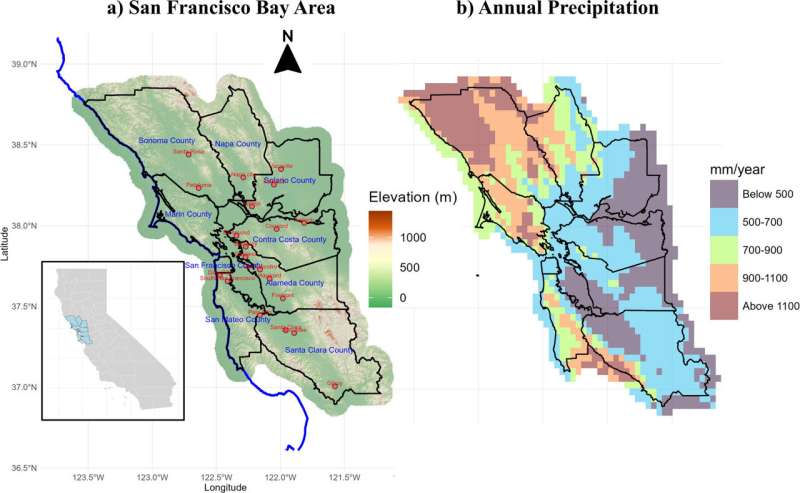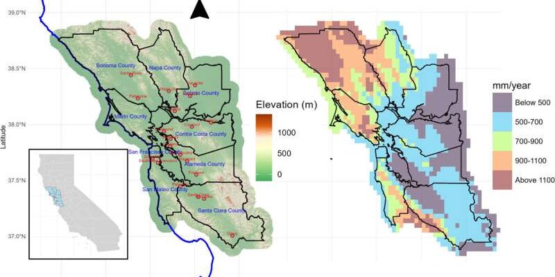 (a) Карта дев’яти округів затоки Сан-Франциско із зазначенням висот і пагорбів, отримана з даних Геологічної служби США (https://www.usgs.gov/3d-elevation-program). Джерело: Міжнародний журнал кліматології (2025). DOI: 10.1002/joc.70120