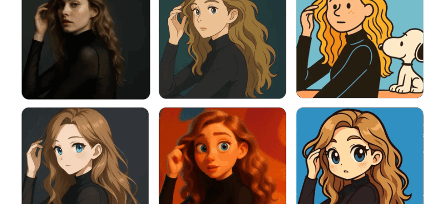- Стилізація — перетворити селфі на аніме, олію, акварель, cyberpunk, ретро-фото, комікс, Pixar-стиль тощо.
