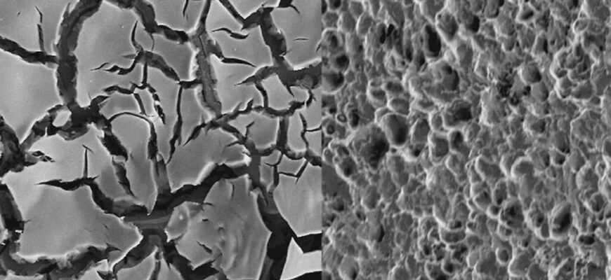Зображення, отримані за допомогою скануючого електронного мікроскопа, (ліворуч) свіжих електродів і (праворуч) використаних електродів через 24 години. Чорні плями на використаному електроді пояснюються забрудненням вуглецем.
