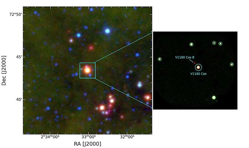 Ліва панель: Кольорове композитне зображення, отримане за допомогою зображень W4 (22 мкм), W3 (12 мкм) і W2 (4,6 мкм) WISE, показаних відповідно червоним, зеленим і синім кольорами. Поле зору (FoV) цього кольорового композитного зображення становить ?10? ? 10? навколо V1180 Cas. Блакитна рамка показує поле зору TANSPEC. Права панель: кольорове композитне зображення складається з зображень TANSPEC K, H та J, показаних відповідно червоним, зеленим та синім кольорами. Блакитне коло показує розташування V1180 Cas, а опорні зірки, які використовуються для обчислення зміщень для калібрування інструментальних величин, позначені зеленими колами. Джерело: arXiv (2025). DOI: 10.48550/arxiv.2512.20085