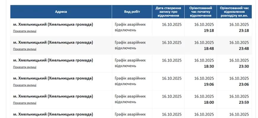 У “Хмельницькобленерго” повідомили про чергове застосування графіків аварійних відключень (ГАВ) на всій території Хмельницької області. Відключення для