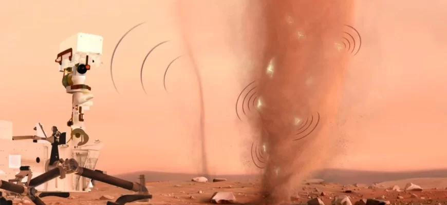 На Марсі пилові вихори регулярно формуються під дією сильних вітрів. Під час проходження марсохода Perseverance крізь два таких вихори мікрофон приладу SuperCam зафіксував надзвичайно інтенсивні сигнали. Йдеться про перший мікрофон, встановлений на Марсі. Аналіз показав, що ці сигнали мають електромагнітне походження.