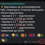 Спочатку вимкнули світло – потім повідомили про збільшення обсягів відключень. В такому режимі відбулося чергове, восьме, коригування графіка погодинних відключень від обленерго сьогодні, 9 квітня на Хмельниччині. Мешканці області вже встигли емоційно відреагувати на відключення… Read more: Хмельницькобленерго без попередження знеструмило частину споживачів області