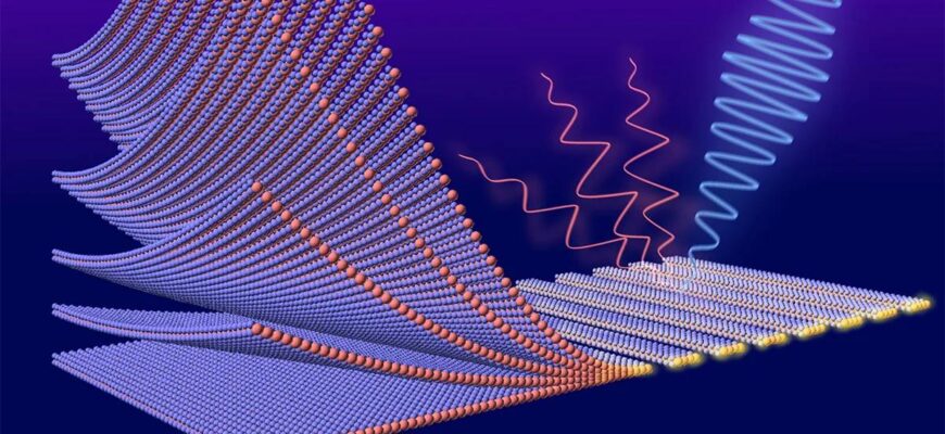 42 нанометри — це приблизно 200 атомів молібдену, покладених один на одного. У цій структурі товщиною менше, ніж довжина хвилі видимого світла, фізики примусили інфрачервоні фотони «крутитися» у пастці, не виходячи назовні, — використавши явище, передбачене фон Нейманом і Вігнером ще у 1929 р. і лише тепер реалізоване в такому ультратонкому матеріалі. Коли три таких «закольцьованих» фотони стикаються і зливаються в один — пастка блискавично спалахує синім. Це — не ефект заради ефекту: саме така здатність потрібна, щоб одного дня замінити кремнієві мікросхеми на фотонні.