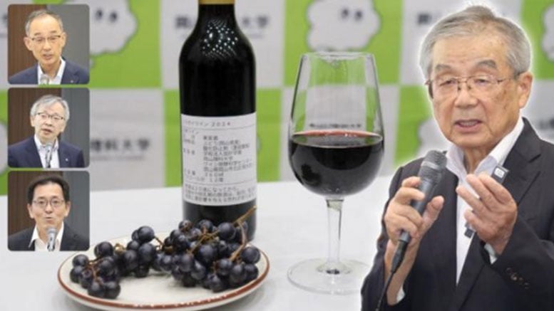 Плоди та вино з нещодавно виведеного сорту винограду “Мускат Ширагай”, представлені на прес-конференції почесним професором Такудзі Хошіно (праворуч). Зліва направо вгорі: Заступник мера міста Курашікі Кенджі Комацу, президент OUS Хіроюкі Хірано та генеральний директор виноробні “Фунао” Кенічіро Міяке. Фото: Науковий університет Окаяма