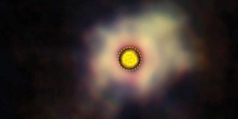 Хмари пилу відбивають світло зірки навколо зірки R Doradus. Наближаючись до кінця свого життя, зірка скидає свої зовнішні шари, утворюючи навколо себе хмари газу і пилу (показані тут рожевим і жовтим кольорами). Вчені давно вважали, що світло зірки, яке освітлює ці хмари, може живити зоряний вітер. Але колір світла навколо зірки, відбитого пилом, показує, що пилові зерна занадто малі, щоб пояснити вітер зірки. Знімок зроблено в поляризованому видимому світлі за допомогою VLT/SPHERE. У центрі, жовтим і помаранчевим кольорами, ми бачимо зображення ALMA, що показує поверхню зірки. Джерело: ESO/T. Schirmer/T. Khouri; ALMA (ESO/NAOJ/NRAO)